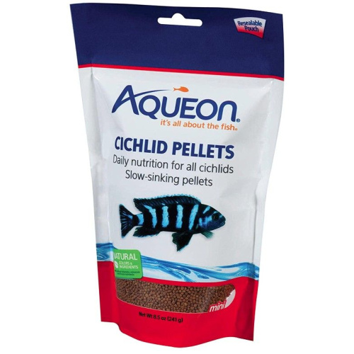 Aqueon Mini Cichlid Food Pellets - 8.5 ozAqeon Mini Cichlid Food Pellets are made with premium ingredients, like shrimp meal, to attract the most finicky cichlids. Available in a variety of pellet sizes for small to large cichlids as well as oscars and discus. The color enhancing formula is a blend of marigold, chili powder, and astaxanthin to help promote brilliant colors in fish.