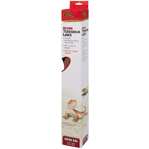 Zilla Brown Terrarium Liner - 40 Breeder/50 Gallon Tanks - (17.25"L x 35.25"W)Simply roll out the plush green or brown carpet and cut to size as needed. Made from an absorbent, non-abrasive material that won't irritate sensitive feet, these liners are also treated with a biodegradable enzyme that reduces reptile odors. To clean, simply rinse with cold tap water and reuse. Ideal for juvenile reptiles that may accidentally ingest loose bedding when striking food. Zilla is committed to producing innovative products to build and maintain a healthy reptile habitat. From terrariums to bedding, lighting to d?corZilla provides all the necessary components for the successful keeping of reptiles and amphibians.