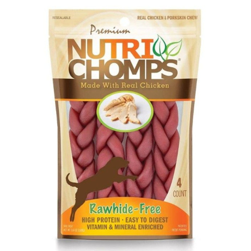 Premium Nutri Chomps Chicken Flavor Braids are rawhide-free dog chews made with real, oven-baked chicken and pork skin. Nutri Chomps chews are completely edible and fortified with essential vitamins and minerals, with a tough braid shape that provides dogs with a satisfying chewing challenge.