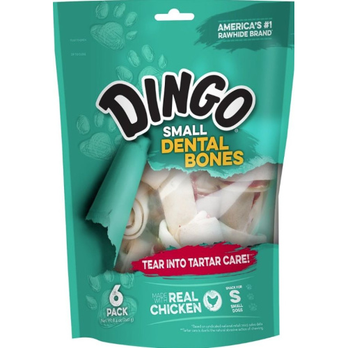 The Dingo brand combines powerful flavors and benefits to create bones, chews and treats that are sure to keep you and your dog wanting more. With a wide variety of shapes and flavors, there are options for any size companion. Dingo Mini Dental Bones give you a small treat or chew in the classic bone shape dogs love. Made with real chicken, Dingo Dental Bones, for Total Care, are a daily oral health chew that reduces tartar and plaque and freshens breath due to the natural action of chewing, and thats something you and your pup can smile about. Each small chew is made with real chicken in the middle, giving your pup flavor that will have their tails wagging! Feed one Dingo Dental Bone a day as a treat or snack. Always provide plenty of fresh drinking water. Keep your chews fresh with the resealable pouch. This package contains 6 Small Dental Bones.