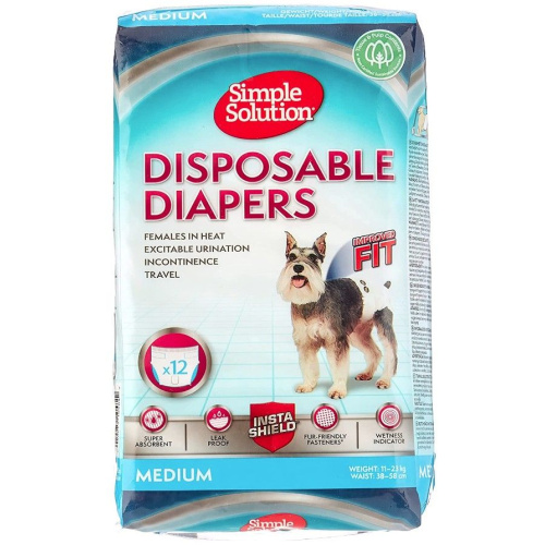 Simple Solution Disposable Diapers offer protection for female dogs with poor bladder control. A unique, stretchable fabric with fur-friendly fasteners fits snugly around your pets waist, where leak-proof barriers and a super absorbent core prevent any mess from spreading to the floor.