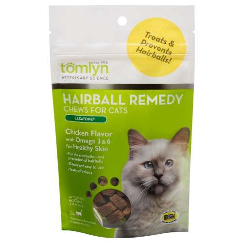 Tomlyn Hairball Remedy Laxatone Chews gently eliminate and prevent the formation of hairballs. Made with mineral oil, soy lecithin, canola oil, and Aloe Vera gel, these soft treats lubricate ingested hair so that it passes safely through the digestive tract. Cats love the soft texture and chicken flavor.