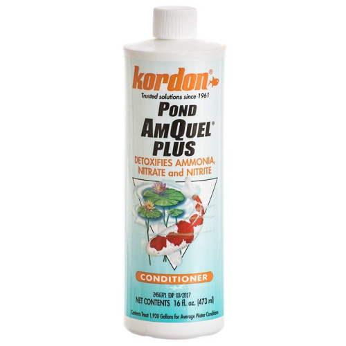 Kordon Pond AmQuel Plus removes chlorine, chloramines, ammonia, nitrates, and nitrites from pond water safely, easily and quickly. AmQuel protects pond fishes and invertebrates by quickly eliminating, in a true single-step action, three of the most toxic chemicals commonly found in water.
